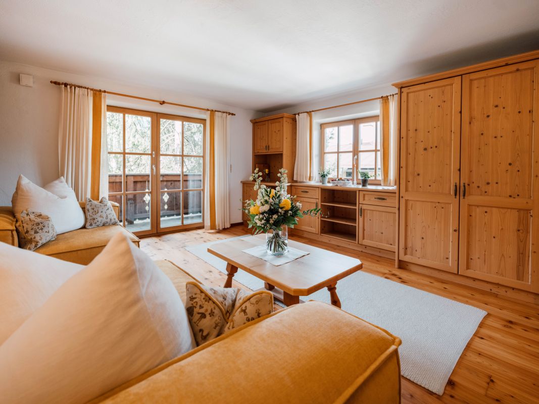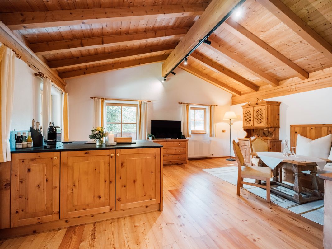 Die traditionell und gleichzeitig modern eingerichtete Obergeschoss-Wohnung verströmt auf 133 m² Wohnfläche dank des freien Sichtdachstuhls ein angenehmes Wohngefühl und überrascht durch stimmige Kontraste und eine edle Materialienauswahl. Herzstück bildet die großzügige und top-ausgestattete Wohnküche, der ideale Ort für gesellige Runden im Kreise der Familie und Freunde. Ein weiteres geräumiges Wohnzimmer, zwei helle Schlafzimmer und zwei Bäder runden das Raumangebot im Geigerhäusl großzügig ab. Dazu sorgen gleich mehrere Flatscreen-TV-Geräte für viel technischen Komfort, den die gemütliche „Alpine Lifestyle“-Einrichtung mustergültig abrundet.