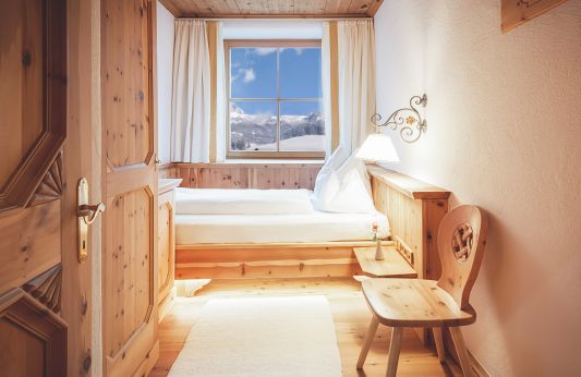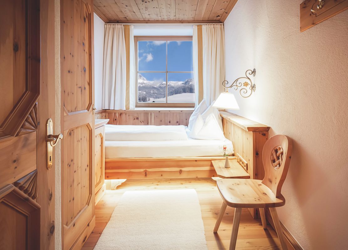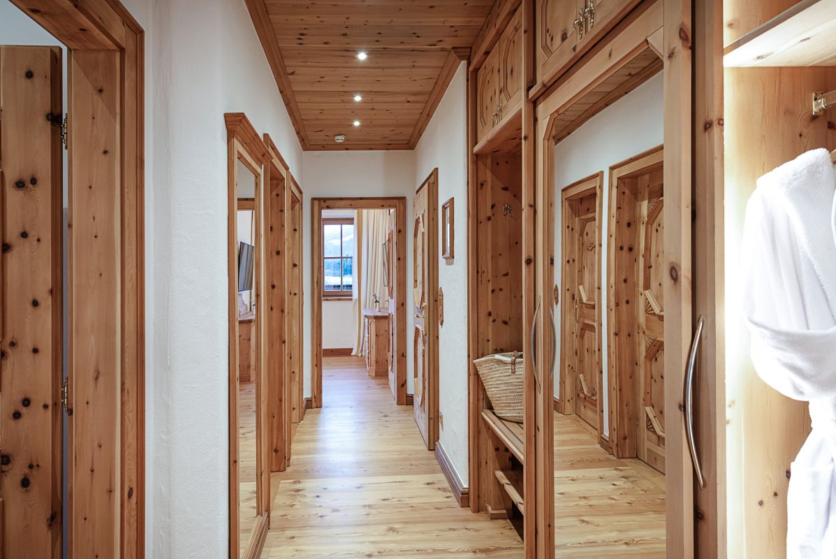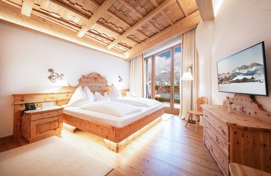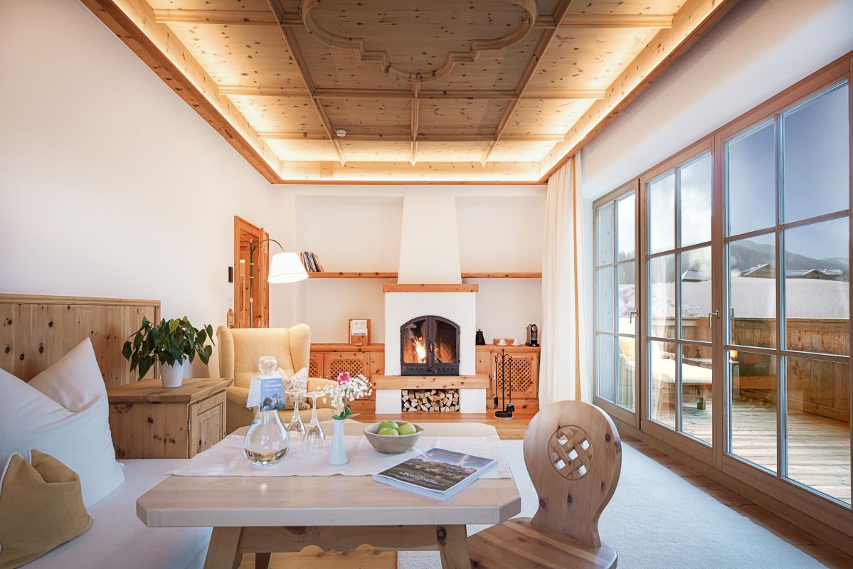 Wohnzimmer mit gemütlicher Lounge-Ecke und offenem Kamin, Schlafzimmer mit Zirben-Doppelbett, Kinderzimmer mit großem Kuschelbett, 1 Badezimmer mit Doppelwaschbecken, Badewanne und Dusche, getrenntes WC, Telefon, WLAN, Minibar, Safe, pro Zimmer ein Flatscreen-TV, Kaffeestation, Balkon mit Blick zum Wilden Kaiser