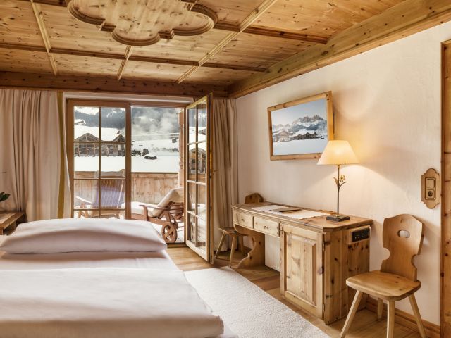 Wohnzimmer mit Lounge-Ecke und offenem Kamin, hochwertige Zirbenholzmöbel, 2 oder 3 Schlafzimmer – davon 1 offenes Schlafzimmer über eine Innentreppe erreichbar, 2 oder 3 Badezimmer mit Dusche und Doppelwaschbecken, 1 x mit Eckbadewanne, getrenntes WC, begehbarer Ankleideraum, Telefon, WLAN, Minibar, Safe, pro Zimmer ein Flatscreen-TV, Nespresso-Maschine mit nachhaltigen Kapseln, Terrasse mit direktem Zugang zur Kaiserwiese