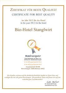 The Hotelnavigator's seal of approval is based on both hotels' own questionnaires and all the relevant online review portals and an evaluation of their ratings. The result is a meaningful verdict on the quality of the hotel. In 2012, the Green Spa Resort Stanglwirt was awarded the certificate for "Best Quality". The "Excellent" award is a quality seal based on evaluations from guests around the world. Thanks to the excellent reviews by our guests, our services received an overall mark of 92 out of a possible 100.