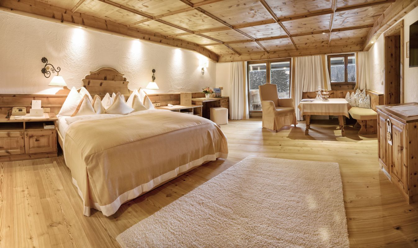 Cosy family-room with Swiss stone pine furniture, bedroom, seperate children’s bedroom with bunk beds or twin-beds, bathroom with bath tub or shower/WC, 2nd small bathroom telephone, Wi-Fi, minibar, safe, flatscreen TV, partly balcony, mostly street side and no view on the ‘Wilder Kaiser’ mountain