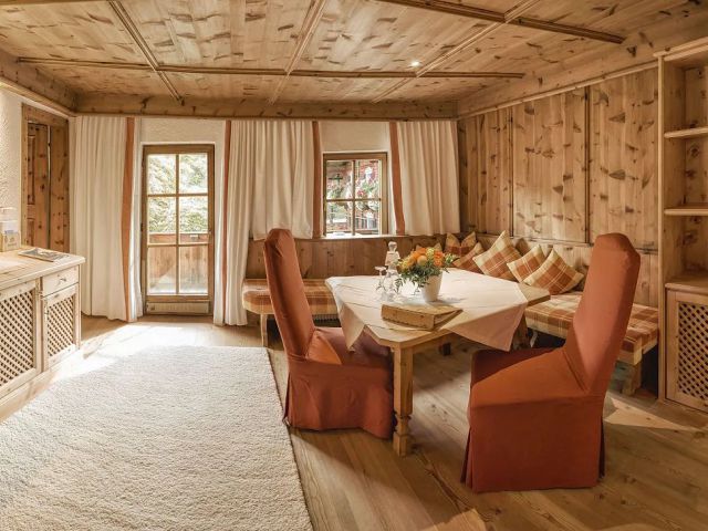 Spacious family-suite with Swiss stone pine furniture, master bedroom, cosy living-room, seperate childrens-bedroom with bunk beds, bathroom with bath tub and shower / WC, walk-in wardrobe, telephone, Wi-Fi, minibar, safe, flatscreen TV, Nespresso machine incl. sustainable capsules, street side, balcony with view on the traditional inn ‘Gasthof’