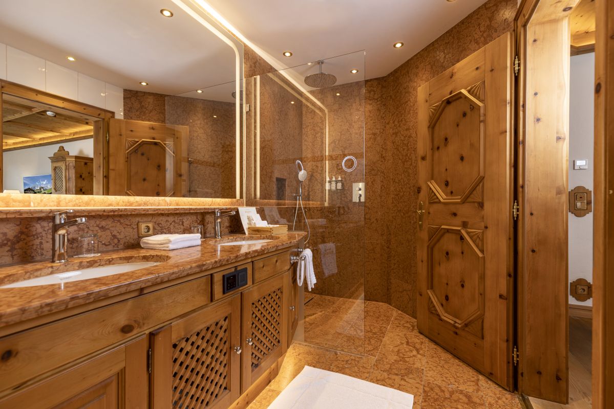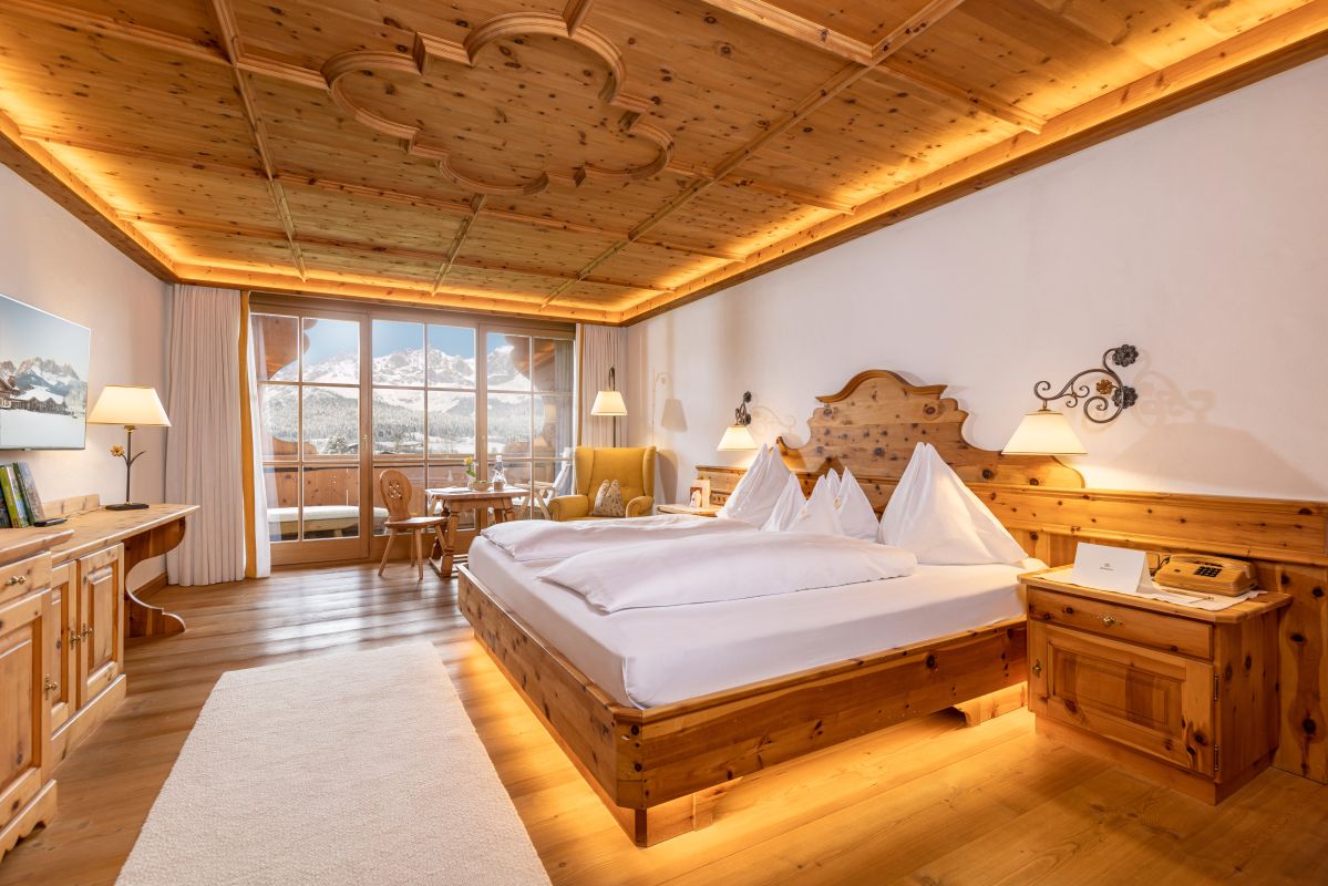 Spacious double room with Swiss stone pine furniture, shower, WC, partially featuring a cosy seating area, telephone, Wi-Fi, mini-bar, safe, flatscreen TV, terrace or balcony – most have view on the ‘Wilder Kaiser’ mountain