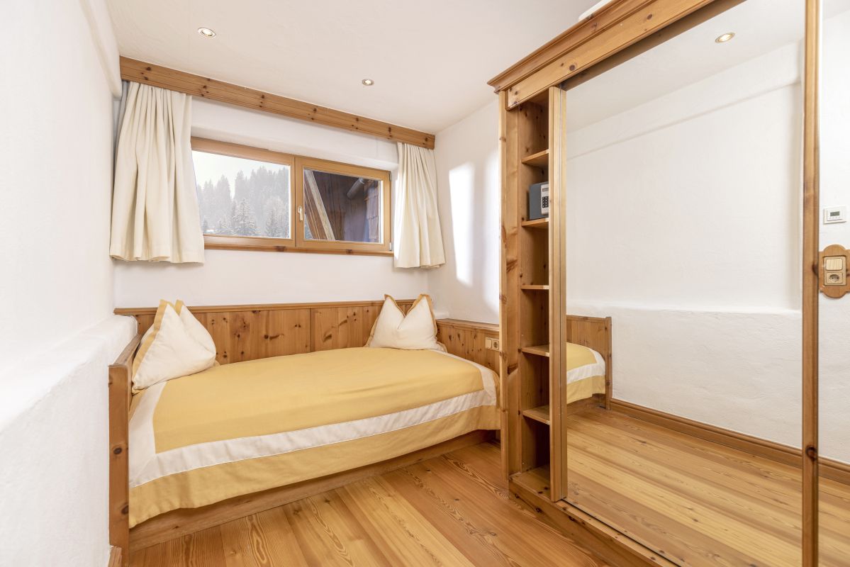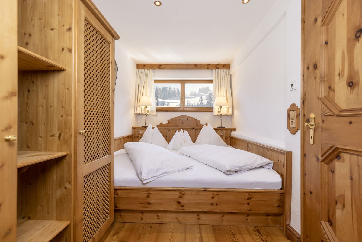 Large living room & bedroom with dining table, cosy seating area and Swiss stone pine double bed, children’s room with large cosy bed, 2nd children’s bedroom with single bed, two bathrooms, each with their own wash basin and WC, one with bathtub and one with shower, telephone, Wi-Fi, mini-bar, safe, flatscreen TV, coffee station, air-con, south-facing rooftop terrace with views on our Lipizzaner stud