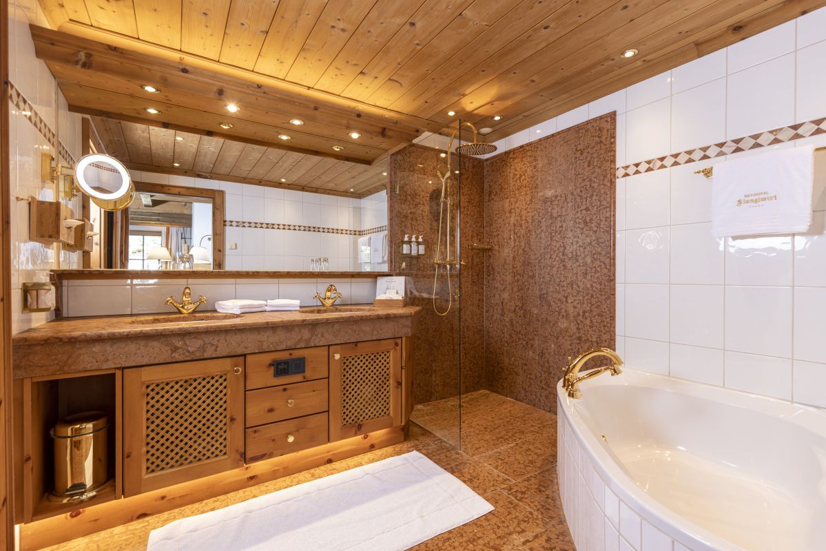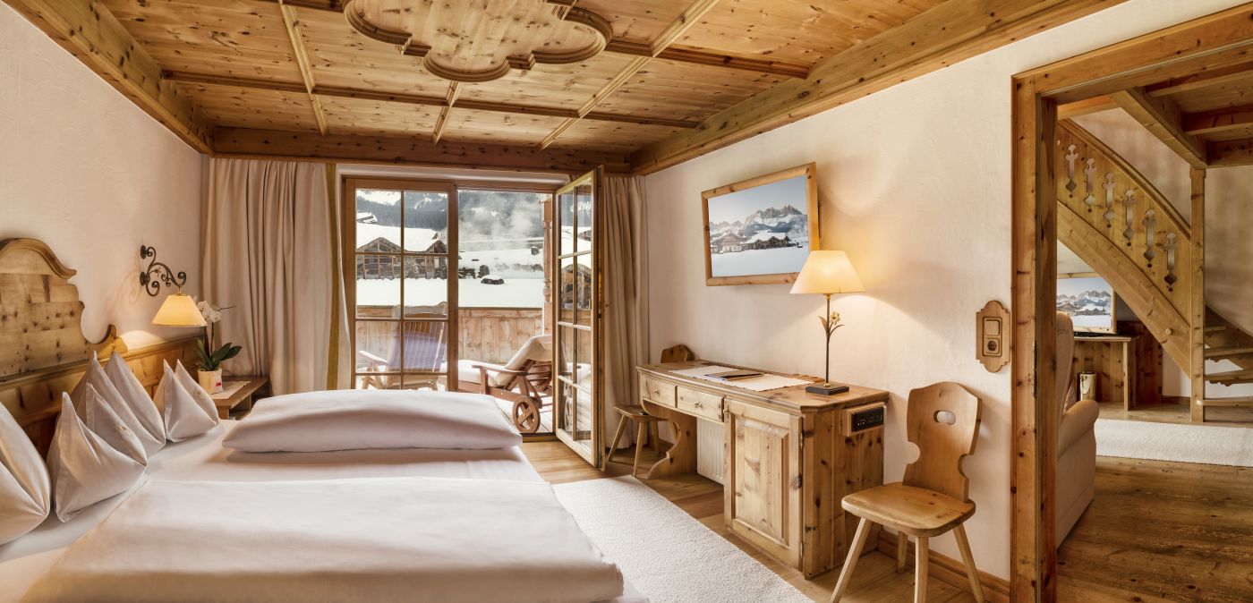 Living room with lounge area and open fireplace, Swiss stone pine furnishings, 2 or 3 bedrooms - of which 1 open bedroom is accessible via an internal staircase, 2 or 3 bathrooms with double washbasin and shower, 1 with corner bathtub, separate WC, walk-in wardrobe, telephone, Wi-Fi, minibar, safe, each room has a flatscreen TV, coffee station, terrace with direct access to the 'Kaiserwiese'