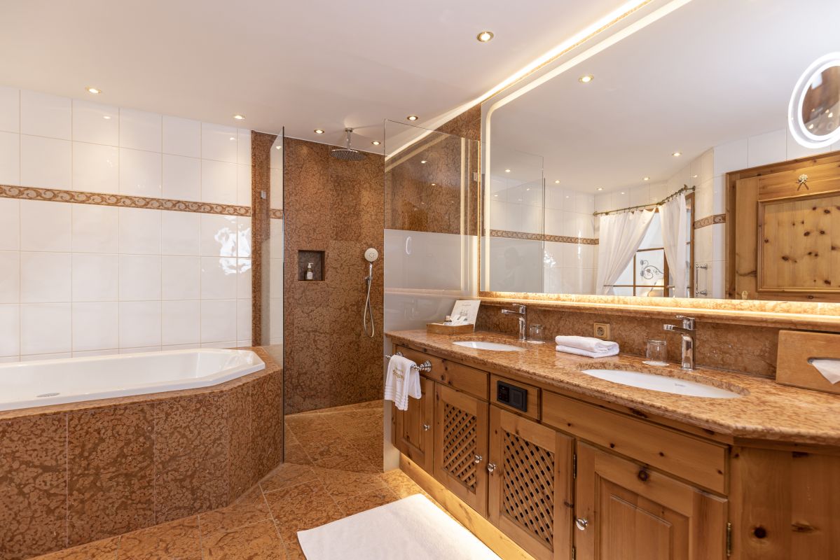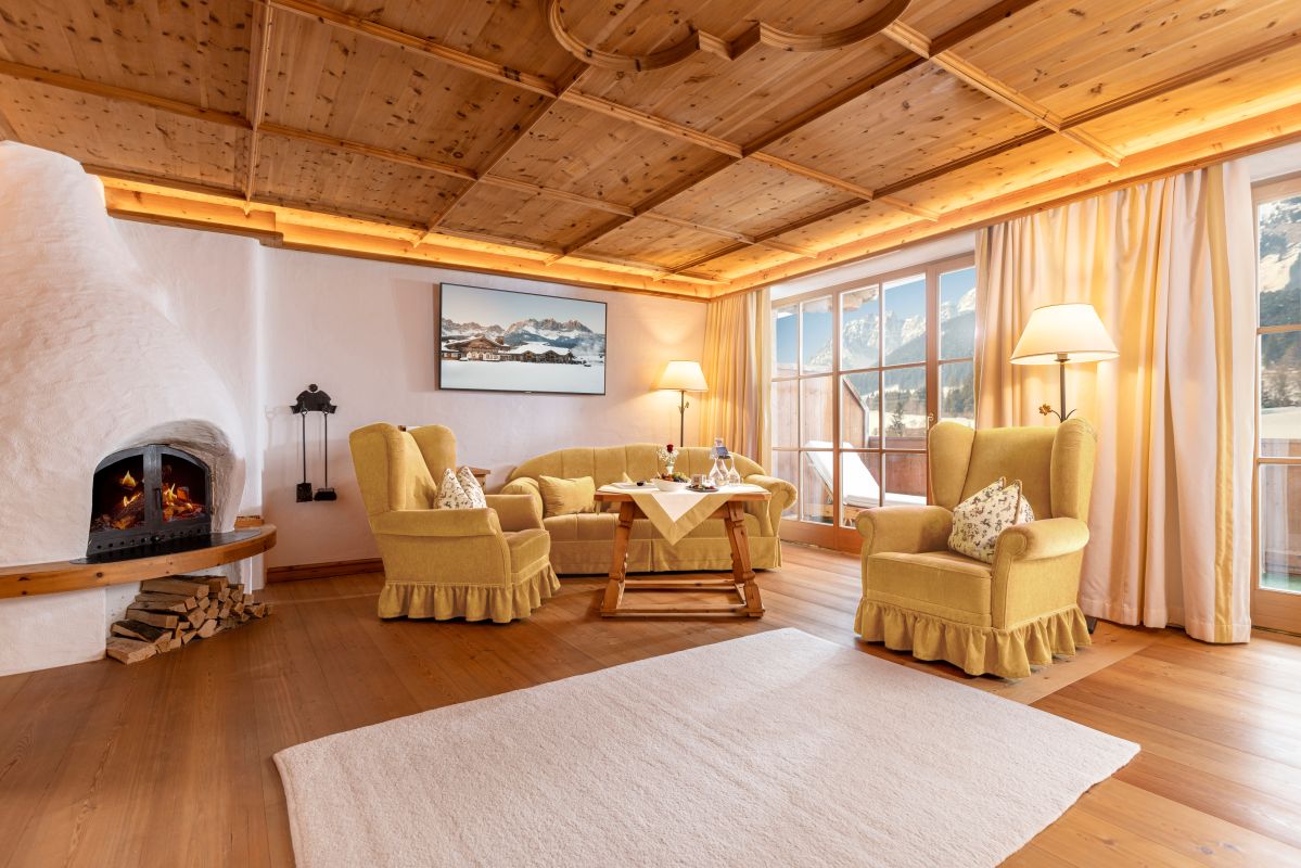 Large living room-bedroom with Swiss stone pine double bed and cosy lounge area, most have an open fireplace, spacious bathroom with double washbasin, corner bathtub and shower,separate WC, walk-in wardrobe, telephone, Wi-Fi, mini-bar, safe, flatscreen TV, coffee station, large balcony or terrace with view on the ‘Wilder Kaiser’ mountain and/or sheep meadow