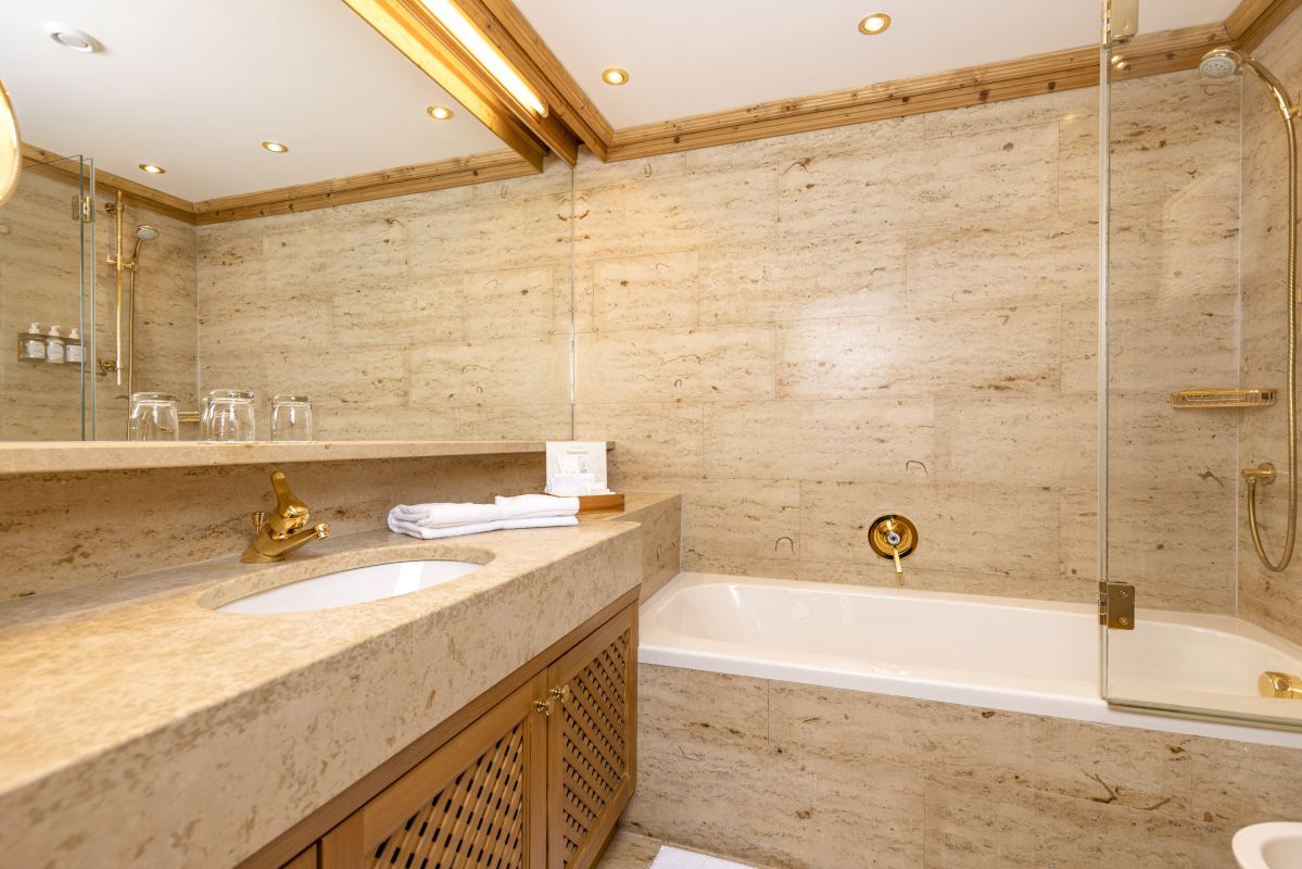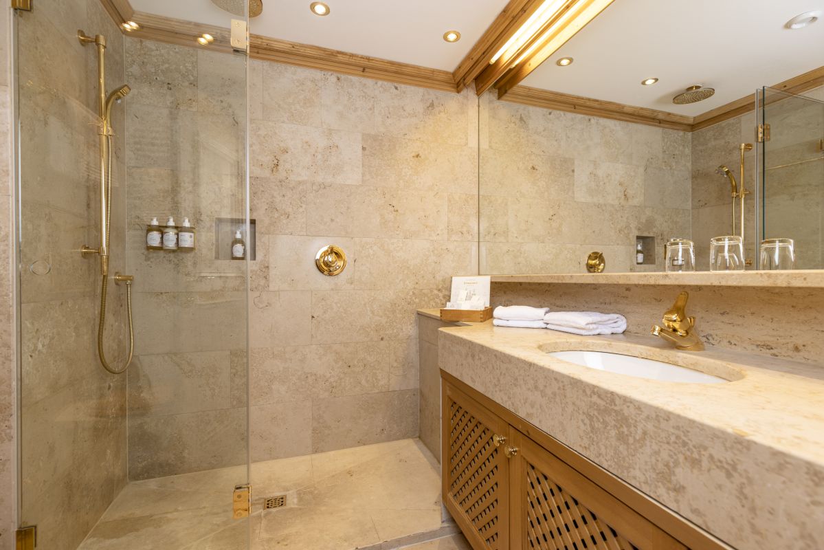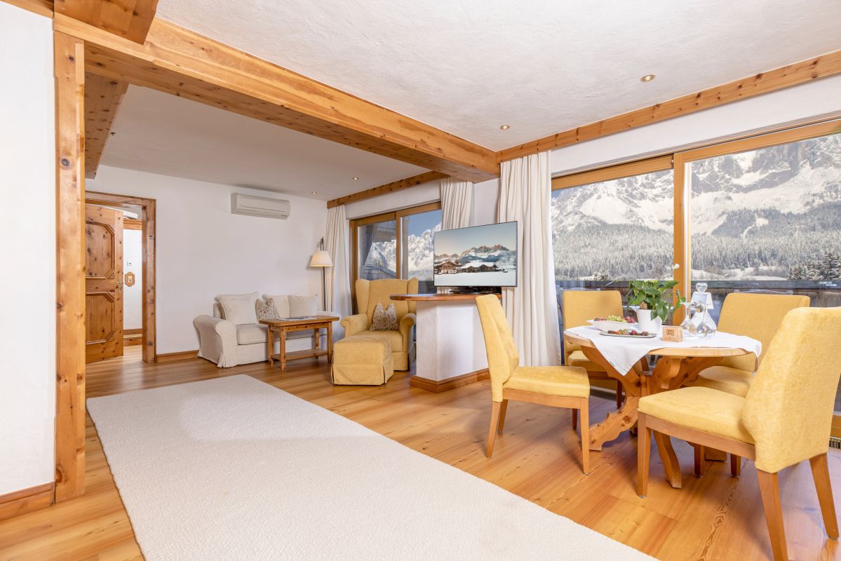 Large living room & bedroom with dining table, cosy seating area and Swiss stone pine double bed, children’s room with large cosy bed, 2nd small children’s bedroom with single bed, two bathrooms, each with their own washbasin and WC, one with bathtub and one with shower, telephone, Wi-Fi, mini-bar, safe, flatscreen TV, coffee station, air-con, roof-top terrace with view on the ‘Wilder Kaiser’ mountain
